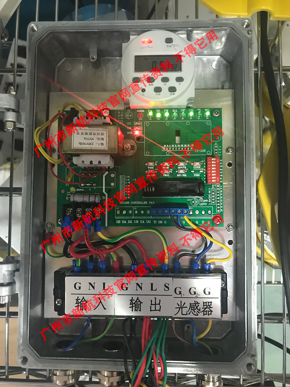 航空障礙燈控制器作為航空障礙燈控制方式中的一種,可以控制航空障礙燈的同步閃爍工作狀態(tài),和燈具的啟停狀態(tài)。航空障礙燈控制器擁有自動功能、手動強制功能和時控功能。廣州市新航科技有限公司提供的航空障礙燈控制器可以滿足航空障礙燈的自動功能,根據光控感受自然環(huán)境啟動切換燈具工作狀態(tài),手動強制功能為手動強開或是關閉的功能及通過時間控制的方式來控制燈具的模式,具體航空障礙燈控制器的實物接線圖示意如下: